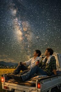 農園の軽トラの荷台で、マサトが缶コーヒーを差し出す。